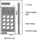 The Annotated Product Drawing is a simplified elevation of a combined swipe card reader and PIN entry terminal for one of the Bewator range of security access systems.