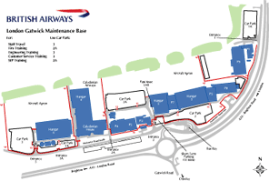 The Site Map is one of a series showing the various levels of maintenance building security access at Gatwick Airport, for British Airways' staff.