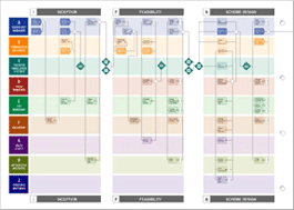 Flowchart for British Airways, describing the relationship between the management of Business Need, Communication, Evaluation, Design, Cost, Procurement, Health & Safety, Implementation and Operation of new buildings and facilities from inception through to completion.